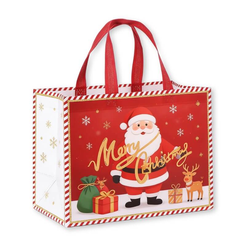 We manufacture custom reusable Christmas shopping bags from durable non-woven fabric. Perfect for festive retail, eco-friendly promotions, and holiday markets. MOQ 5000 pcs.